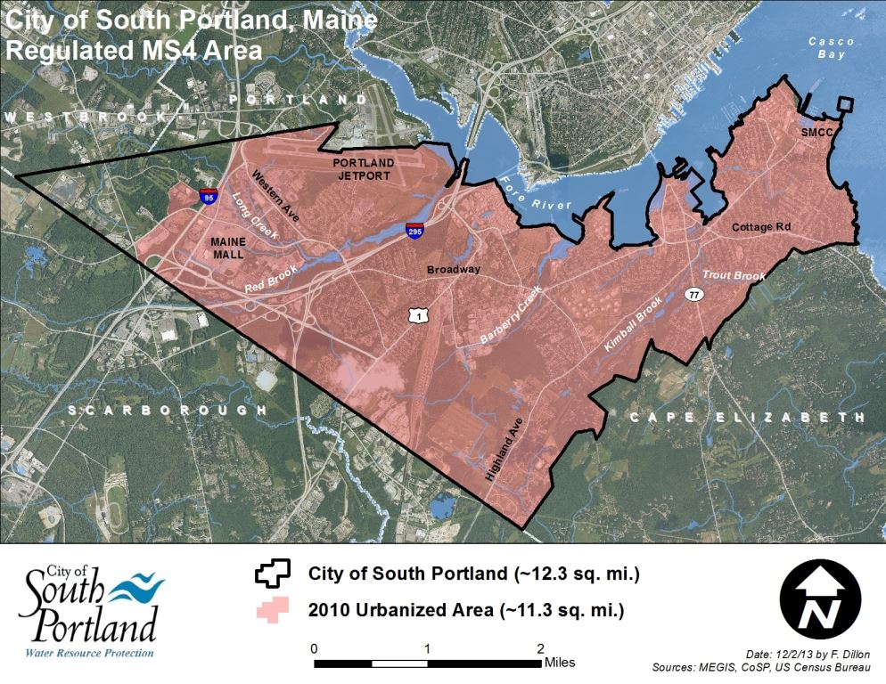 The current General Permit (PDF) identifies 30 MS4 communities in Maine and requires all of them to implement Minimum Control Measures (MCMs) to reduce pollution from stormwater runoff. South Portland's Urbanized Area (JPG) encompasses nearly all of the land in the City except for the area west of the Maine Mall (which is regulated under a separate permitting system).