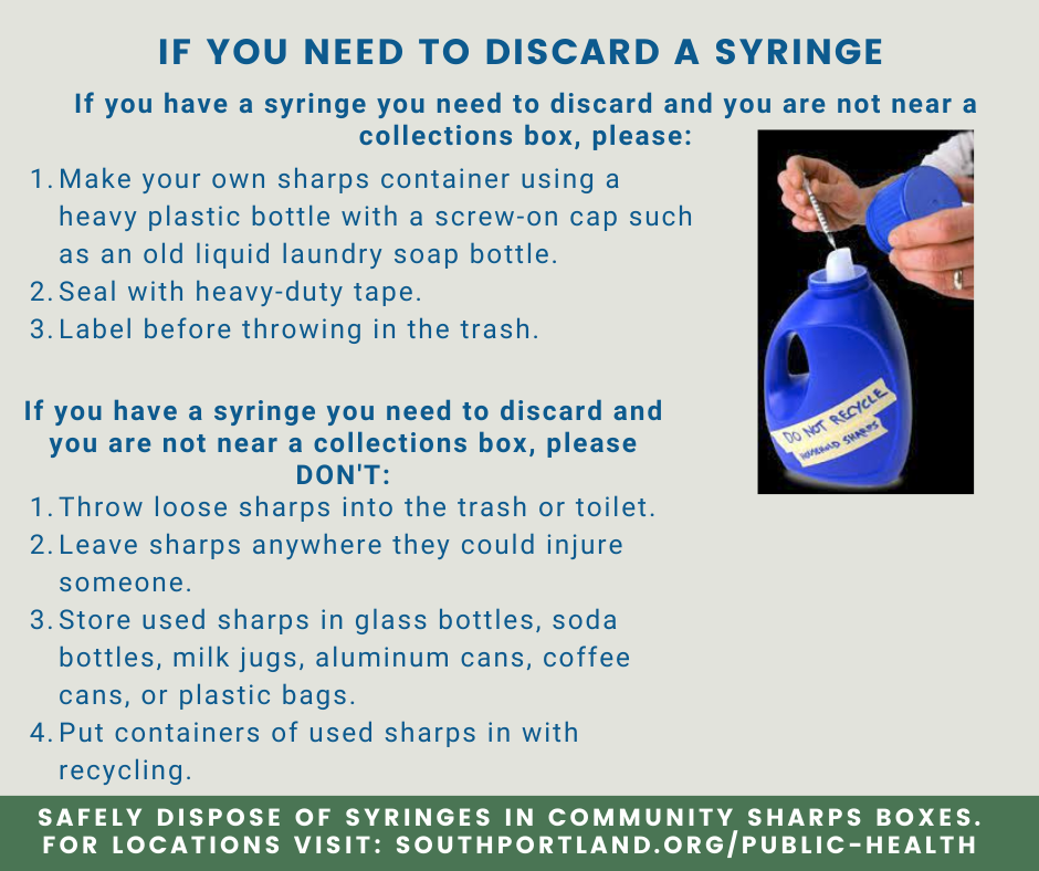 The City of South Portland provides sharps containers for public use at five convenient locations. These sites offer a safe way to properly dispose of medical sharps such as syringes, lancets, and pen needles. For more information on disposal options, visit the Maine Department of Environmental Protection website.
