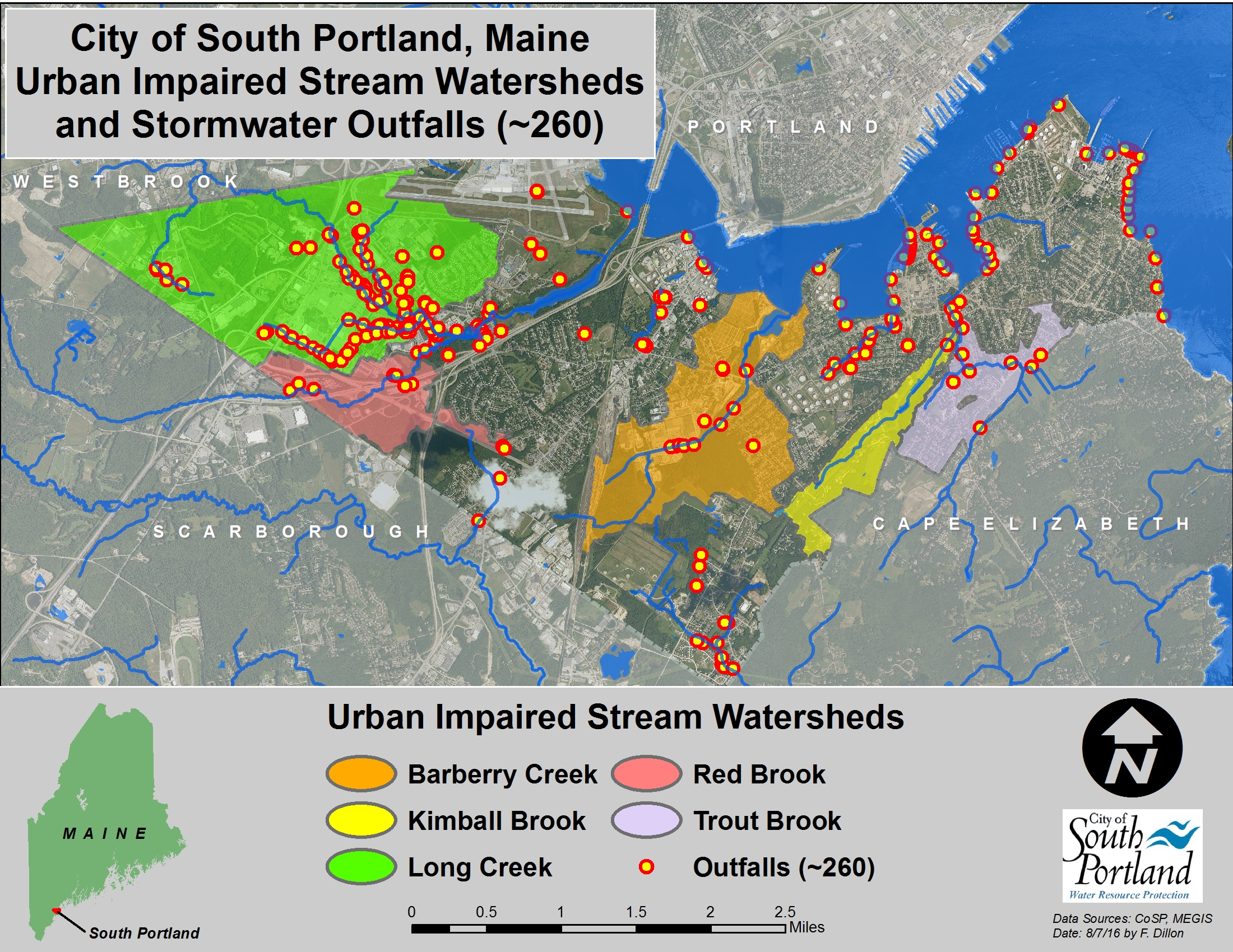 Every 2 years, the Clean Water Act requires the Maine Department of Environmental Protection (MEDEP) to identify waters that fail to meet state and federal water quality standards. The City of South Portland has 5 such impaired water bodies, collectively referred to as “urban impaired streams.” These include the following: