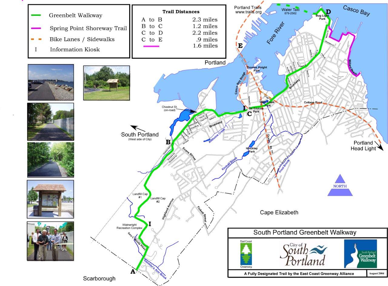 The Greenbelt Walkway is an off-road pathway enjoyed by thousands of residents and visitors each year. From west to east, the trail spans 5.6 miles, from the Wainwright Athletic complex near the Scarborough town line to the historic Bug Light Park, where Liberty Ships were built during World War II.