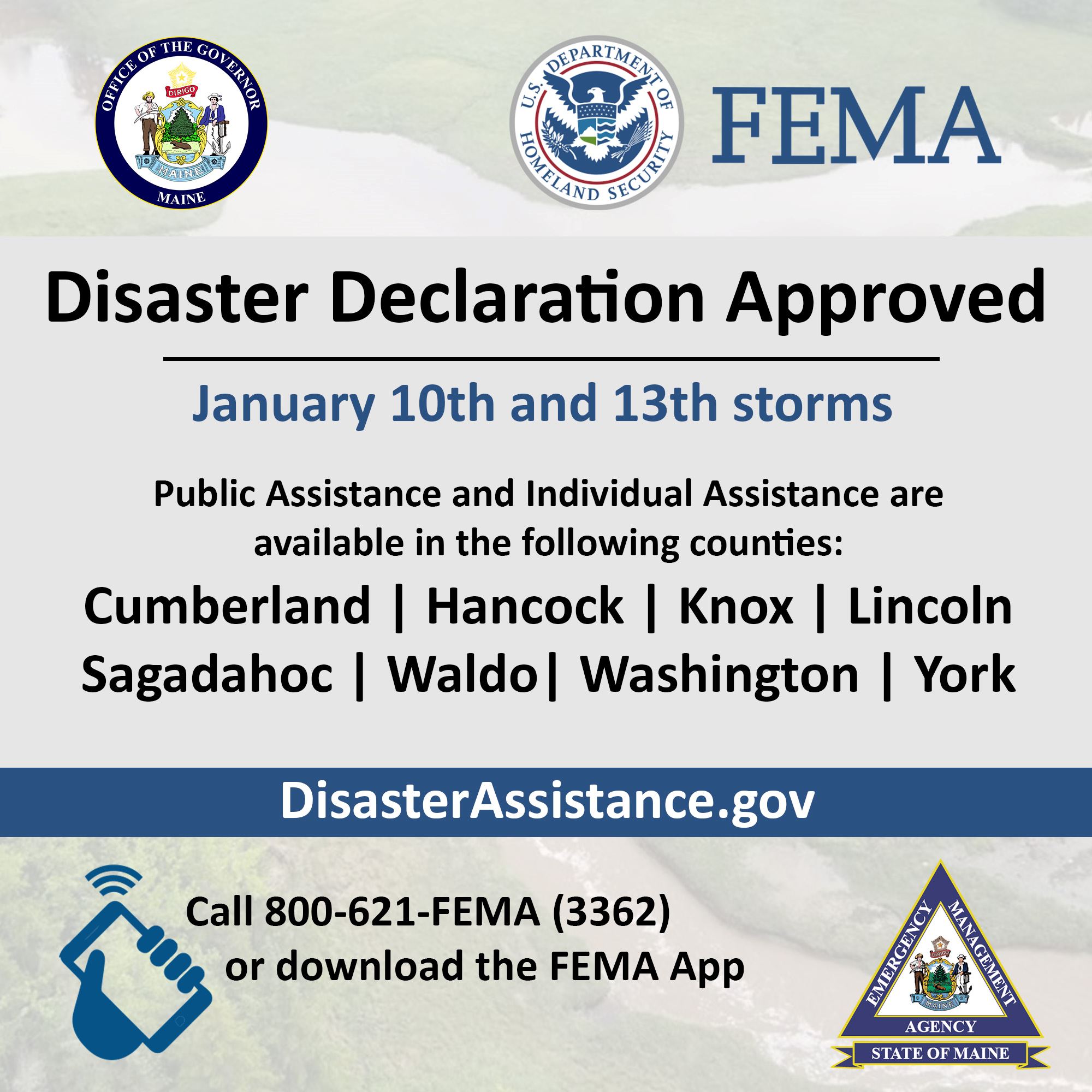 Eight counties have been approved for disaster relief funds following the January 10th and 13th storms. Residents who sustained losses in the designated areas can begin applying for assistance at www.DisasterAssistance.gov, by calling 800-621-FEMA (3362), or by using the FEMA Federal Emergency Management Agency App. Information on Disaster Recovery Center (DRC) locations will be made available on www.maine.gov/flood soon for those that may prefer to meet in person with a FEMA representative.
